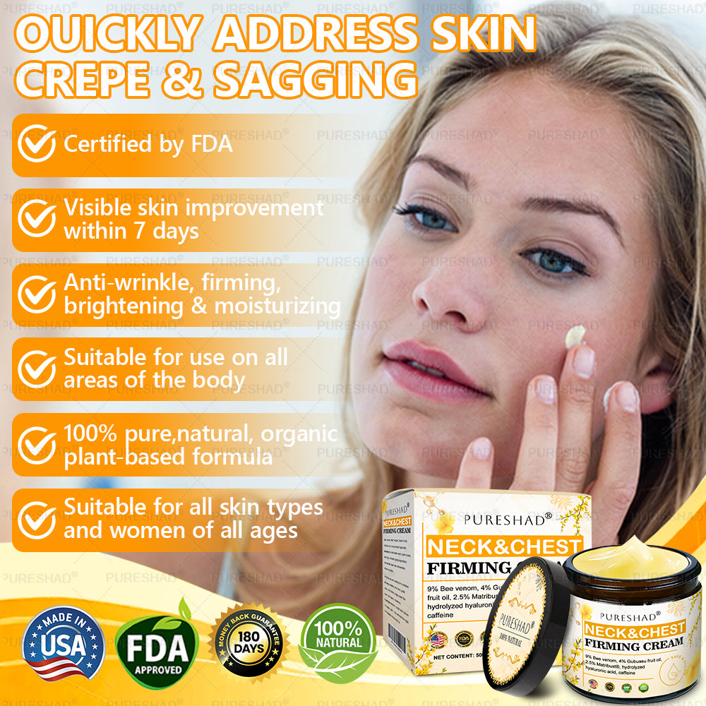Endorsed by Dr. Emily J. Carter, a board-certified dermatologist with over 10 years of expertise in skincare, PureShade® NECK&CHEST FIRMING CREAM comes highly recommended. This exceptional product provides an ideal remedy for an array of skin issues, including neck lines, sagging arms, drooping breasts, chest discomfort, stretch marks, cellulite on the abdomen, thighs, and buttocks, as well as sagging buttocks, among others. Importantly, it achieves these results without any adverse side effects. Crafted entirely from 100% natural plant extracts, this cream is suitable for all skin types, including sensitive skin.